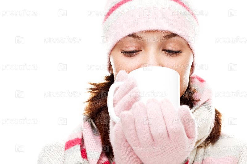 Девушка в теплой одежде пьет чай на белом фоне