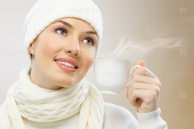 Портрет красивой девушки в шапке с кружкой чая