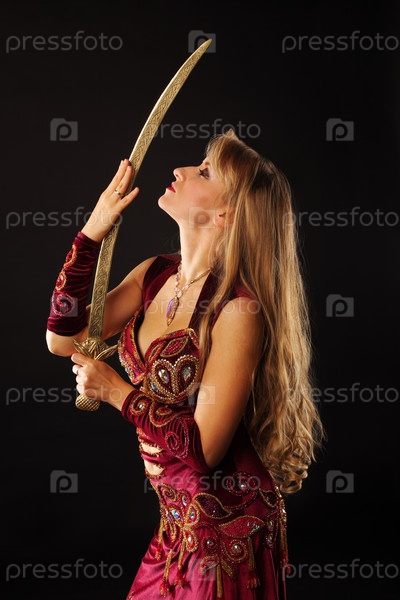 Танцовщица в красном арабском костюме держит меч на черном фоне