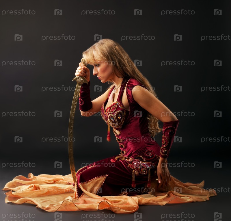 Танцовщица в красном арабском костюме сидит с мечом на черном фоне