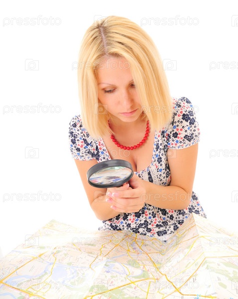 Молодая блондинка смотрит на карту через лупу