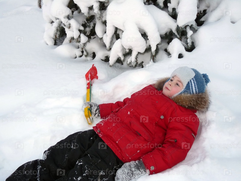 Мальчик в зимней одежде лежит на снегу