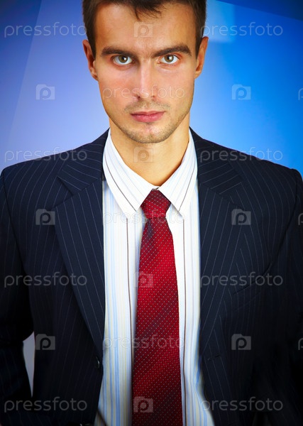 Серьезный мужчина в деловом костюме на синем фоне