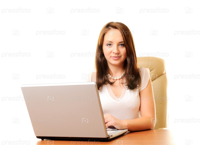 Молодая красивая девушка за рабочим столом с ноутбуком