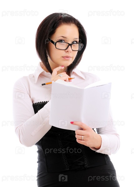 Молодая девушка в очках, одетая в деловом стиле, читает книгу