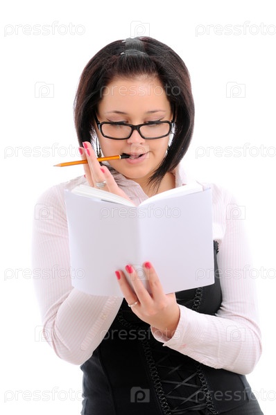 Молодая девушка в очках, одетая в деловом стиле, читает книгу