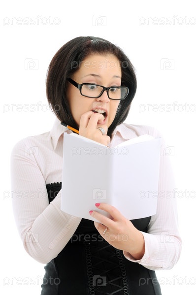 Молодая девушка в очках, одетая в деловом стиле, читает книгу. Удивление