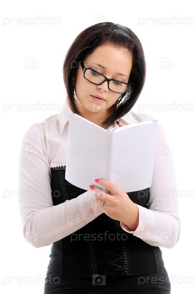 Молодая девушка в очках, одетая в деловом стиле, читает книгу