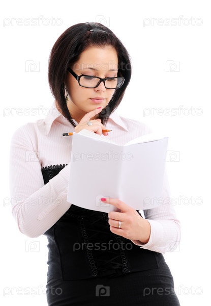 Молодая девушка в очках, одетая в деловом стиле, читает книгу