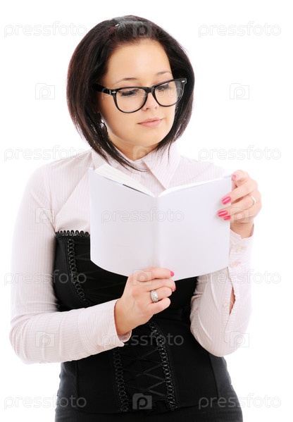 Молодая девушка в очках, одетая в деловом стиле, читает книгу