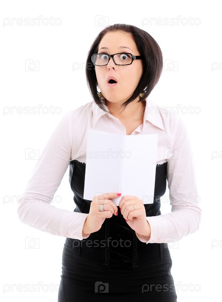 Молодая девушка в очках, одетая в деловом стиле, читает книгу. Удивление