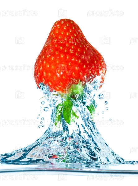 Клубника в брызгах воды на белом фоне