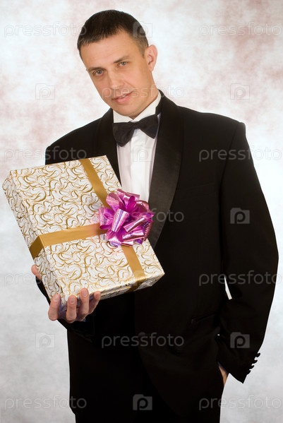 Мужчина в смокинге с подарком