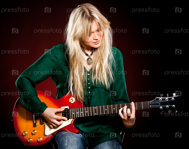 Девушка с гитарой на темно-красном фоне