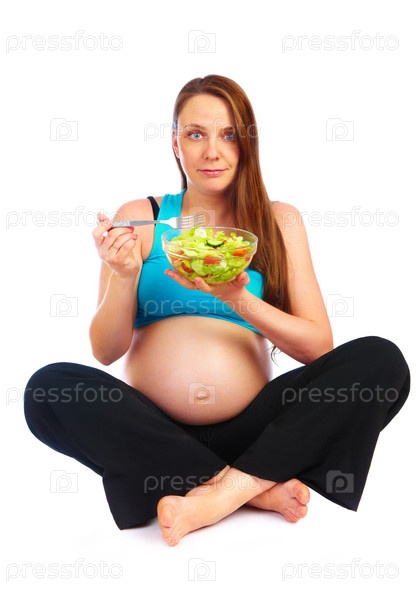 Беременная женщина ест овощной салат