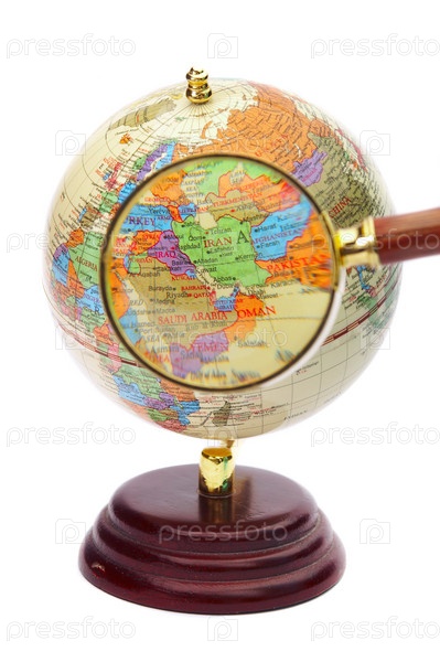 Глобус под лупой на белом фоне