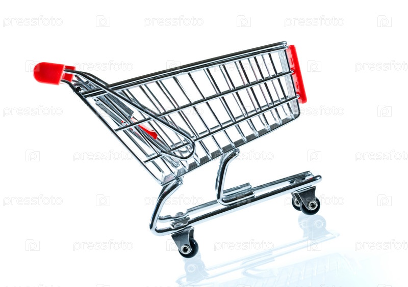 Пустая магазинная тележка на белом фоне