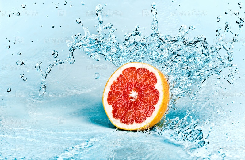 Половина грейпфрута в брызгах воды