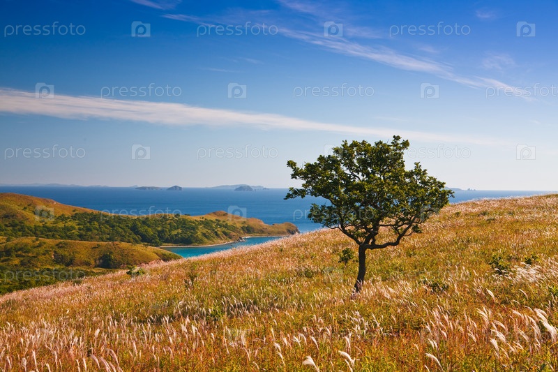 Одинокое дерево на холмистом побережье моря