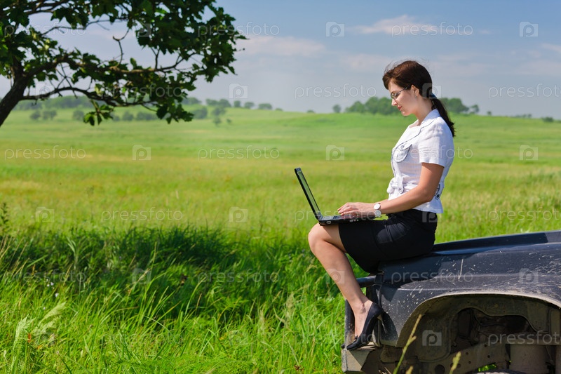 Красивая молодая девушка в деловом костюме сидит на капоте автомобиля и держит в руках ноутбук