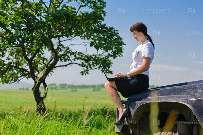 Красивая молодая девушка в деловом костюме сидит на капоте автомобиля и держит в руках ноутбук