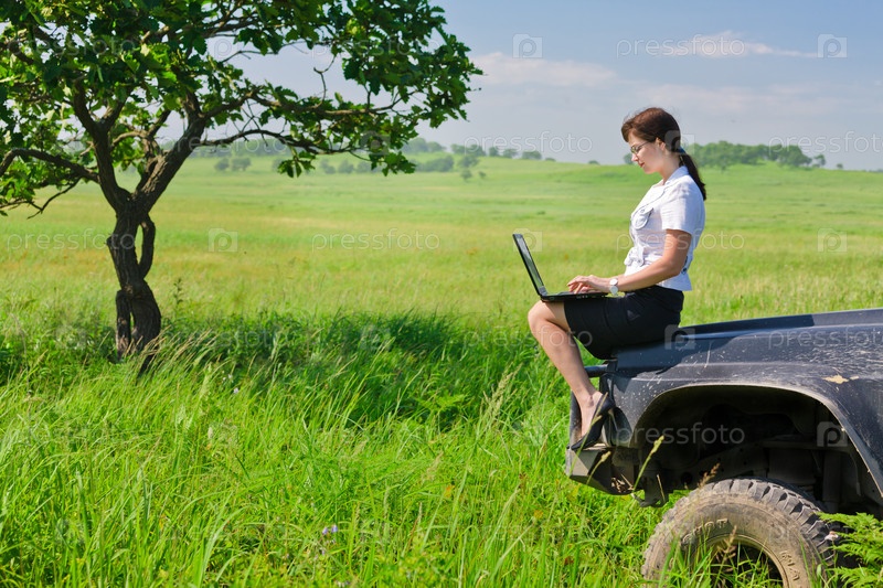 Красивая молодая девушка в деловом костюме сидит на капоте автомобиля и держит в руках ноутбук