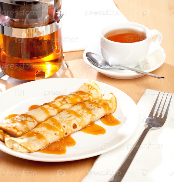 Два блина с карамельным сиропом и чай