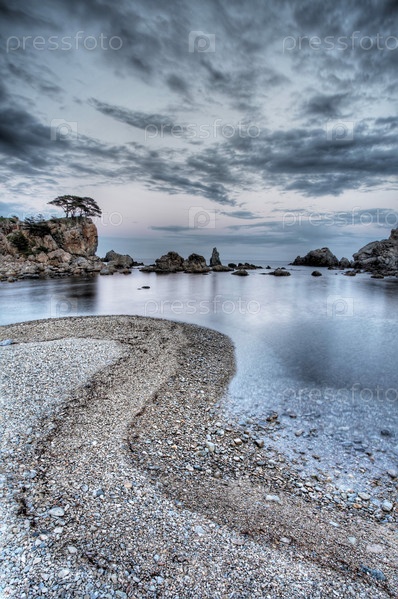 Морской пляж и прибрежные скалы под вечерним облачным небом