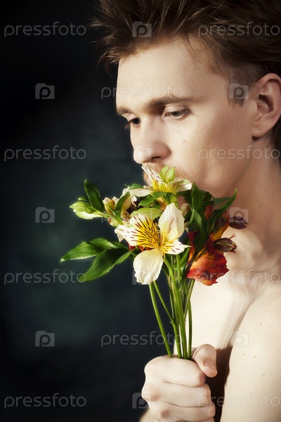 Молодой человек с букетом цветов
