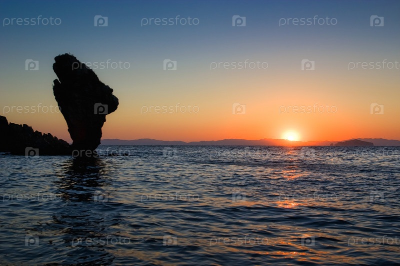 Причудливая скала у берега моря на фоне заката