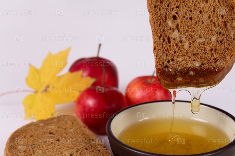 Хлеб, мед и яблоки удалены с близкого расстояния на льняной салфетке