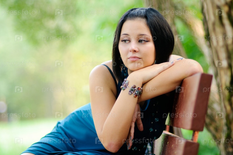 Красивая девушка сидит на скамейке в парке