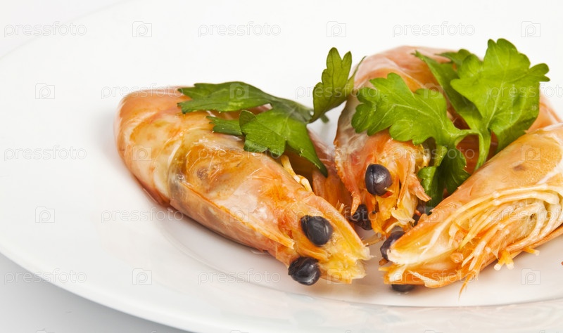 Креветки с зеленью на белой тарелке