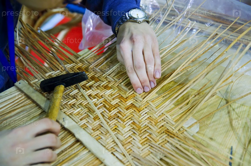 Мужчина за плетением корзины