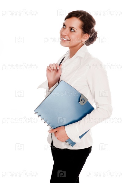 Деловая женщина с папкой в руке на белом фоне