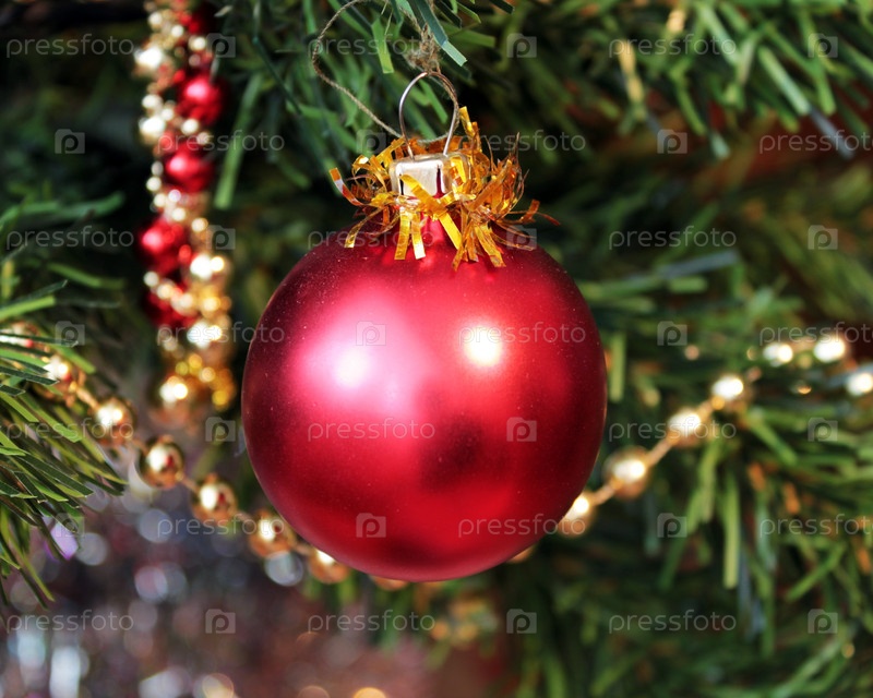 Красный шар и бусы на елке