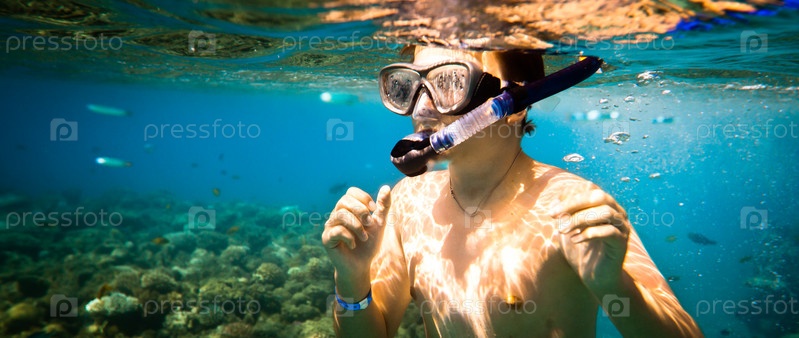 Мальчик в маске с трубкой под водой