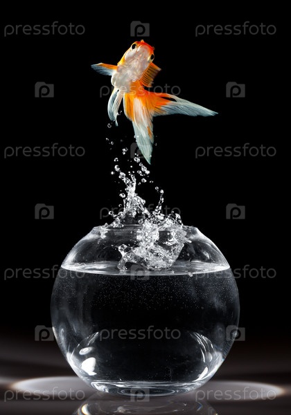 Золотая рыбка выпрыгивает из аквариума, темный фон