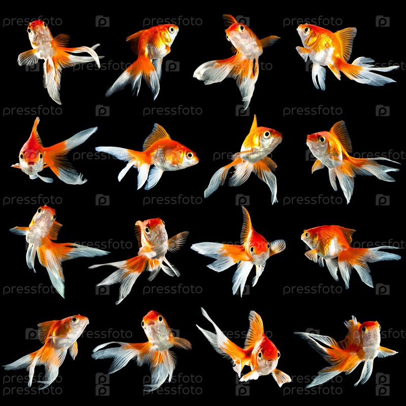 Шестнадцать золотых рыбок, изолированных на черном фоне