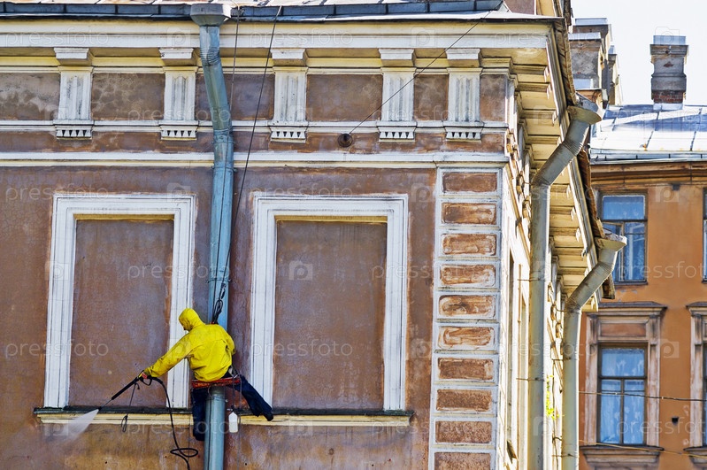 Рабочий моет фасад здания