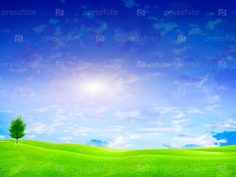Одинокое дерево в поле на фоне голубого неба