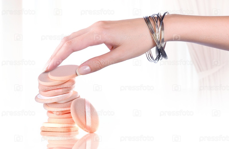 Стопка спонжей под рукой на светлом фоне