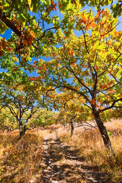 Узкая дорожка и осенние клены на фоне синего неба