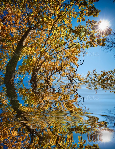 Осенние деревья на фоне солнечного синего неба отражаются на водной поверхности