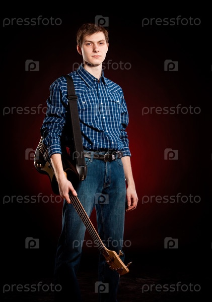 Мужчина с гитарой на темно-красном фоне