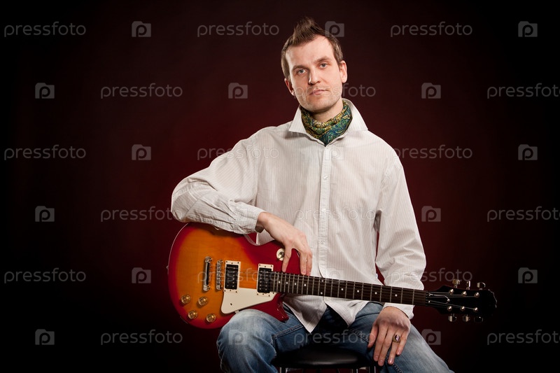 Мужчина с гитарой на темно-красном фоне