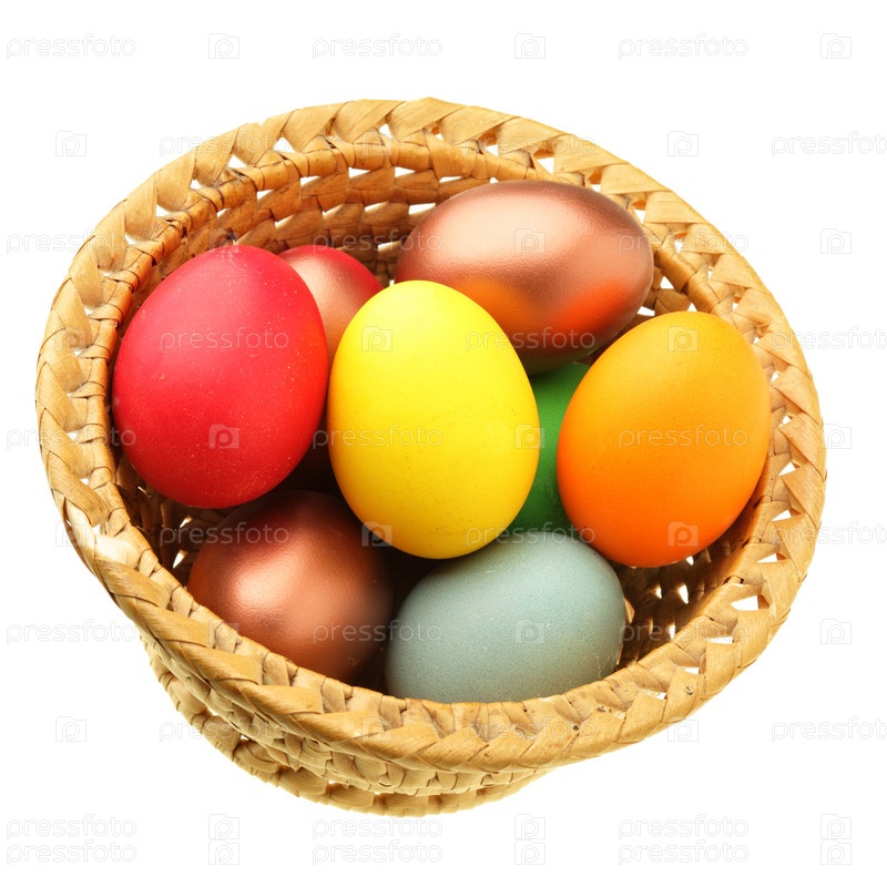 Пасхальные яйца в корзинке изолированы на белом фоне. Вид сверху