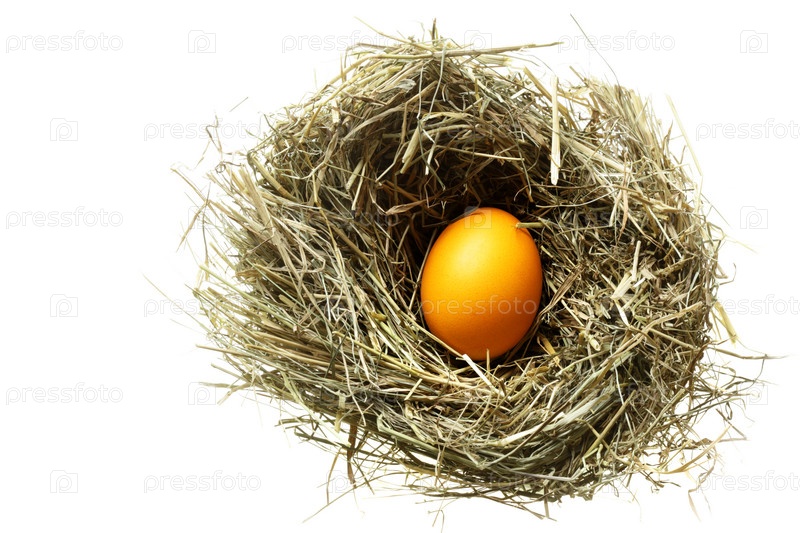 Яйцо в соломенном гнезде, изолированном на белом. Вид сверху