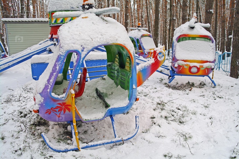 Детская карусель с вертолетами в парке зимой