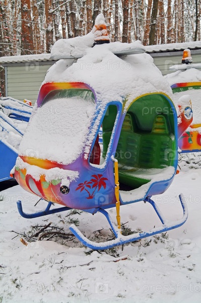 Детская карусель с вертолетами в парке зимой